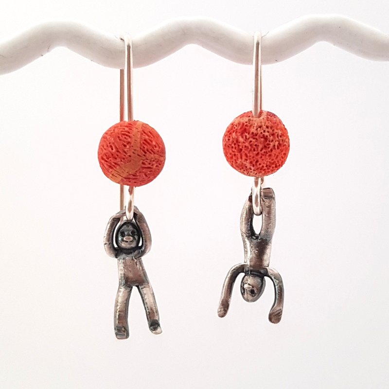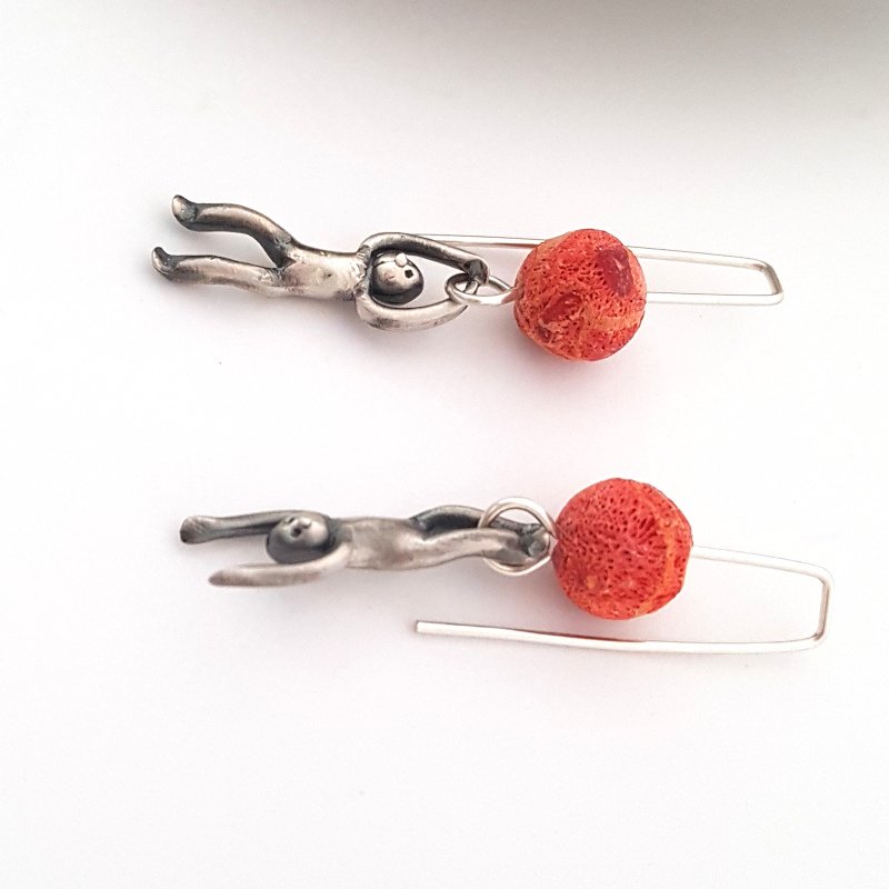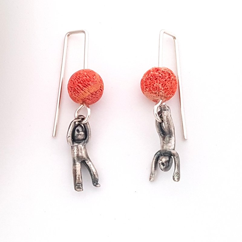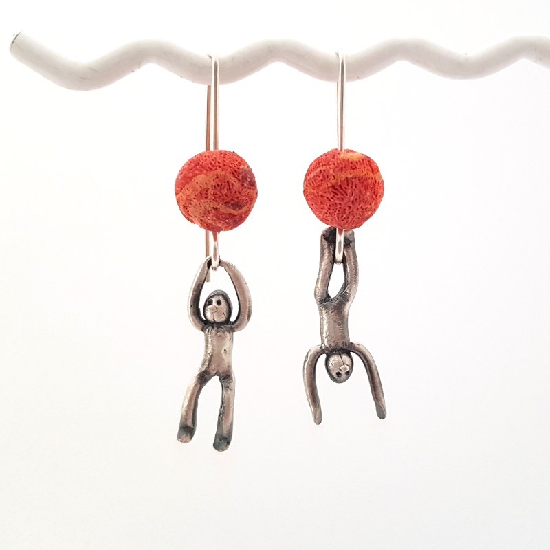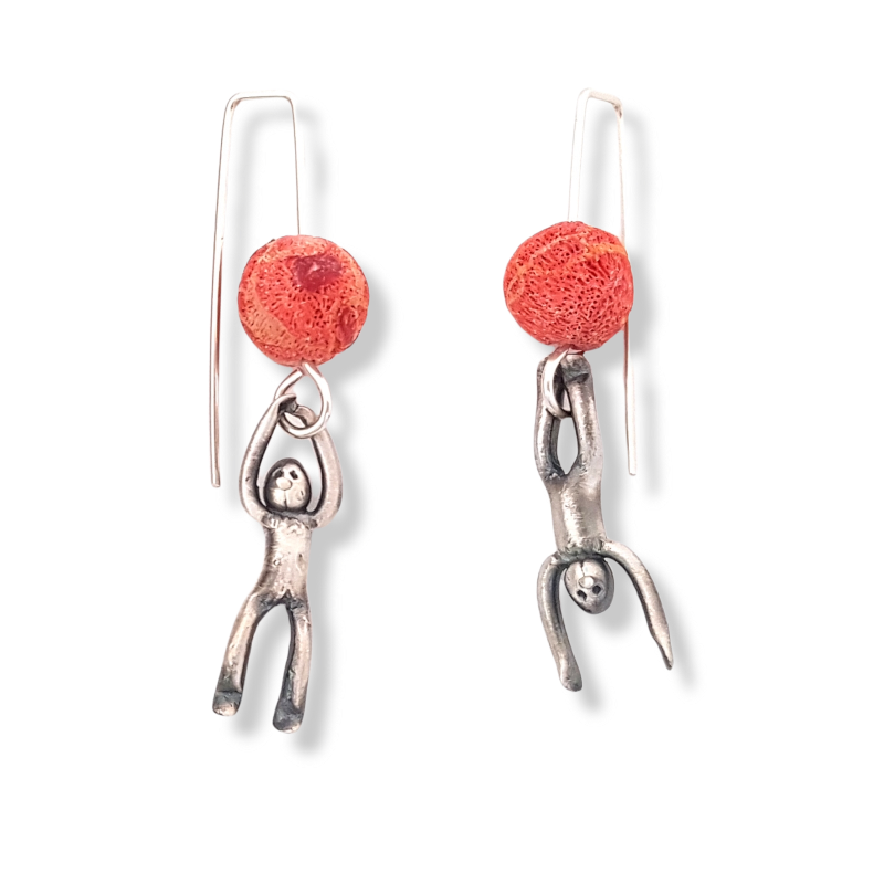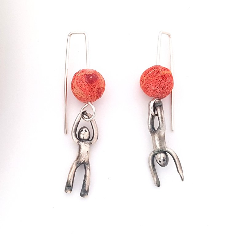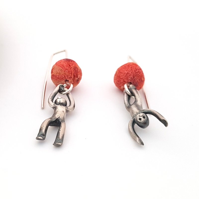 These are solid sterling silver earrings that feature little men hanging up and down from a silver wire hook. There is a round red sponge coral bead that goes through the wire.
