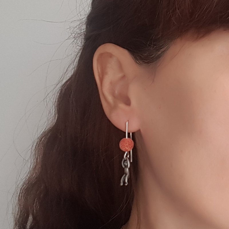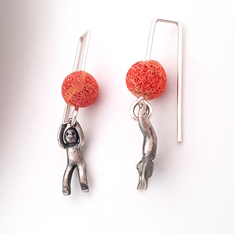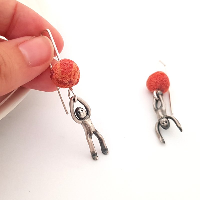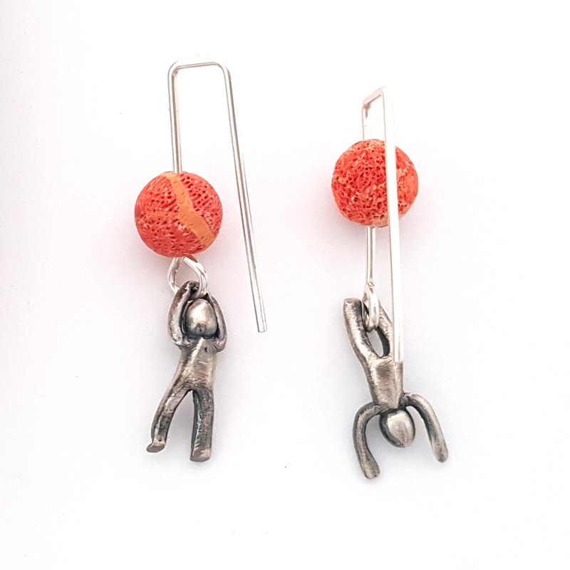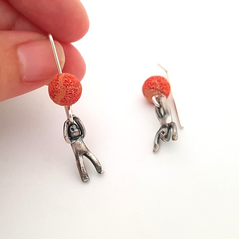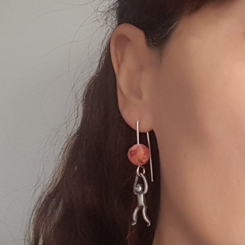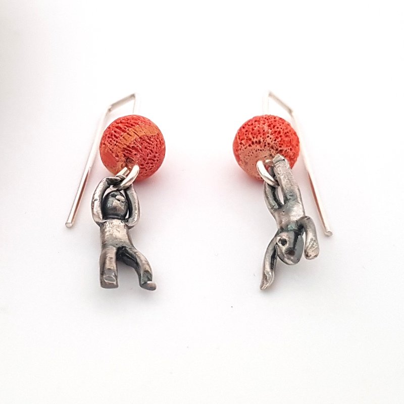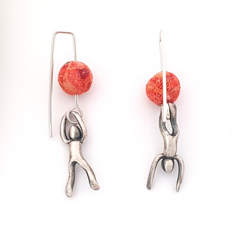 These are solid sterling silver earrings that feature little men hanging up and down from a silver wire hook. There is a round red sponge coral bead that goes through the wire.